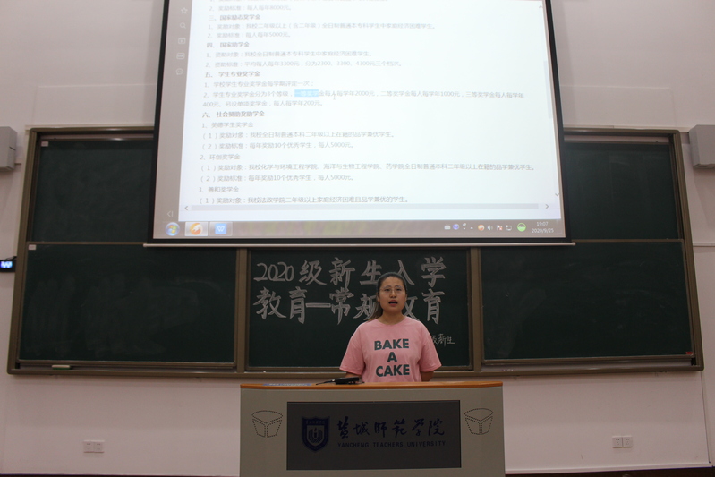 接着,学习部部长张叶雨简述新生们的应该遵守的课堂与晚自习规范,包括无早餐课堂、按时上课、保证课堂纪律等常规性要求,其中特别对学业预警作简单说明,以学业预警提醒同学们大学学习的重要性。在严肃的学习要求之后是劳卫部的副部长单梦玥上台,她带着可爱亲切的示范文档,用着最近火热的表情包将劳卫部的日常检查事项一一叙述,并展示学长学姐的宿舍作为学习模范,同时也有部分宿舍被拿出来当做了反面教材。同为高频率日常检查的治保部也采取了同样的方式。部长周荣烨则用近期大一新生们自己的一些不规范行为去提醒他们遵守宿舍规章,治保部的工作是保障员工宿舍生活安全的重要工作。人走关灯,人走不留电、不用违章电器看似是一件小事,形成习惯却可以大大减少宿舍发生紧急事件的概率。会议最后,常规部门责任主席龚成相对会议作简单总结,再一次鼓励同学们积极参与文体活动,并强调无早餐课堂与治保条例的重要性。