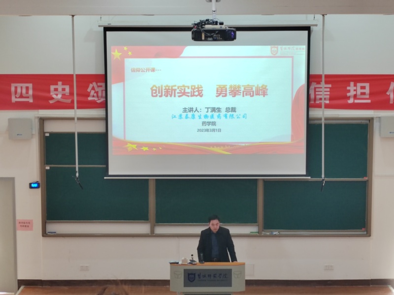 3月1日下午,304永利邀请江苏泰康生物医药有限公司执行总裁丁满生博士在城资楼A200教室开展了“创新实践 勇攀高峰”主题信仰公开课。讲座由药公司党总支副书记、经理耿荣庆主持,304永利2019级、2021级全体同学参加。