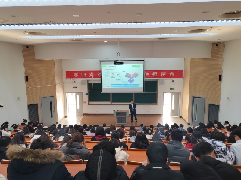 丁满生从生物药的特点介绍、全球生物药产业发展现状、泰康公司发展历程三个方面为同学们上了一节精彩的公开课。丁满生指出,当前双抗、ADC、基因治疗、CAR-T等是生物药的热点赛道,希望同学们学习时有所侧重。他强调,国家《“十四五”生物经济发展规划》明确提出我国正从“以治病为中心”转向“以健康为中心”,生物经济领域市场主体蓬勃发展,我们药学人生逢其时,施展才干的舞台无比广阔。最后,丁满生以总体篇、厂房篇、技术篇、文化篇、发展篇、福利篇、生活篇、学习篇等8个篇章介绍了泰康企业的整体情况。他深情地说道:“五年来,盐城师范学院304永利已经累计向我公司输送二十余名毕业生,其表现受到了公司领导同事的一致好评,为公司的发展作出了重要贡献。希望全体在校员工能够珍惜大好学习时光,练就过硬本领,欢迎你们毕业后加入泰康大家庭。”