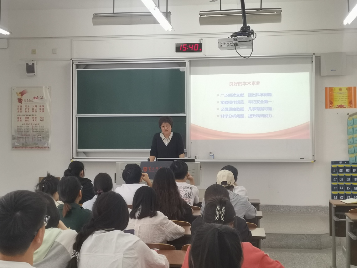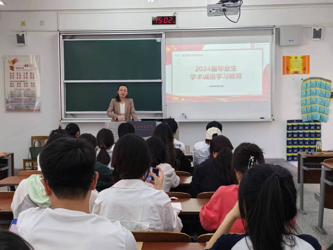 许晓娟首先对同学们经过不懈努力,成功考取研究生表示祝贺。随后,她从近期同学们的毕业论文中存在的种种问题引入,重点强调了什么是学术规范和学术诚信。许晓娟带领大家一起浏览了近10年来国家关于科研诚信与学术道德的法律法规和文件精神,重点解读了2023版《基金委科研诚信规范手册》,强调科研诚信是科研工作者的生命线,任何高校和科研院所对违反科研诚信的行为都是零容忍,要求广大毕业生坚决不触红线。接下来,许晓娟通报了部分2024年国家基金委通报的违反科研诚信和学术道德的典型案例,以鲜活的案例让与会同学更加直观清晰的了解了科研不端行为的界定,并时刻以此为戒。要求同学们科研路上,诚信相伴。