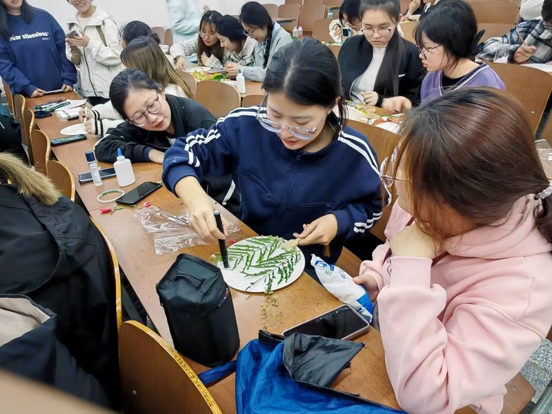 活动现场,工作人员向同学们详细介绍了霜降节气的由来、习俗以及团扇的历史与制作工艺,并分发制作团扇所需的材料,包括胶水、盐以及各式各样的装饰品。在素白的扇面上,同学们认真构图、精心粘贴,将落叶、花朵巧妙地点缀其上,使原本空空如也的团扇瞬间变得“花团锦簇”,充满了生机与活力。