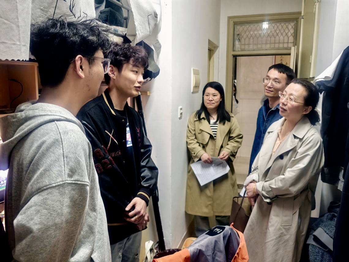 走访过程中,陈倩倩与同学们展开亲切交流,细致询问当前学习和在校生活情况。毕业生宿舍走访主要聚焦考研院校、就业进展及毕业论文完成等内容。对于暂未确定就业去向的毕业生,陈倩倩就员工就业意向、简历优化技巧等方面提供具体指导。毕业生伍帅动情地说:“四年间,老师们的悉心指导让我从懵懂新生成长为专业人才,课堂和实验室里的言传身教将成为滋养我一生的宝贵财富。”走访中,老师们对宿舍用电、卫生状况等问题提出建议,督促同学们养成良好的生活习惯,确保宿舍的安全和整洁。