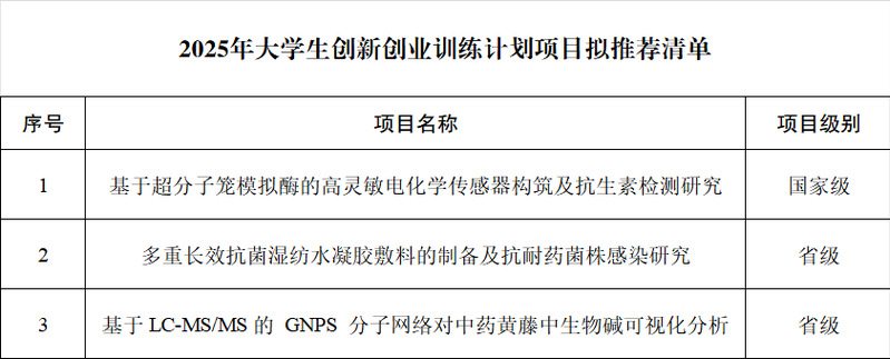 根据盐城师范学院教务处《关于开展2025年老员工创新创业训练计划项目立项和结题验收工作的通知》(盐师院教〔2025〕12号)文件精神,经个人申报,学院教授委员会评审,拟推荐1项国家级项目和2项省级项目报送教务处,特此公示。