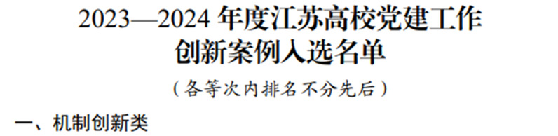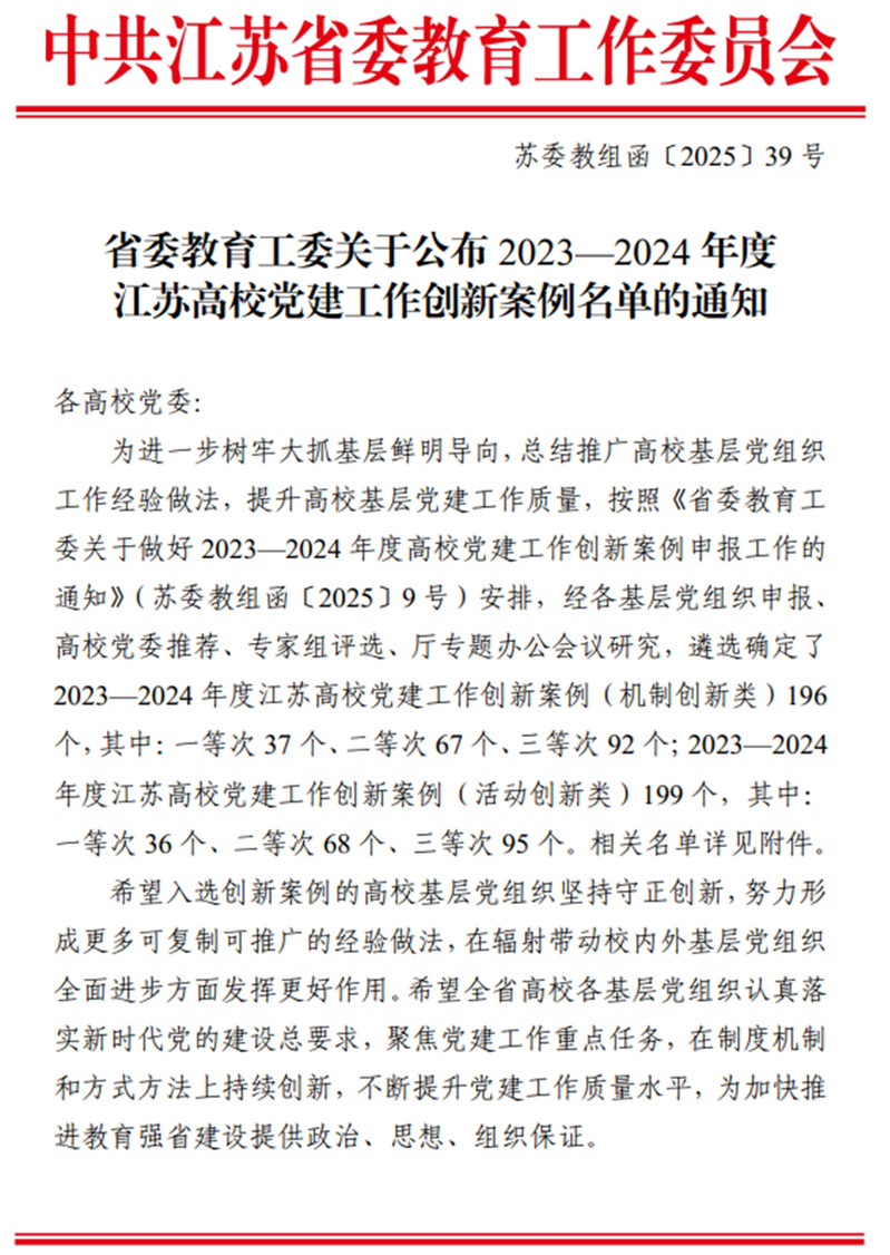 近日,江苏省委教育工委公布了2023-2024年度江苏高公司党建工作创新案例评选结果,公司《聚心·聚智·聚能:“三链”发力 打造校地合作新模式》获得机制创新类案例二等次。