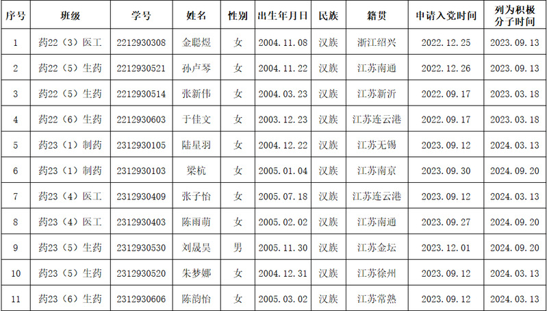 为充分发扬民主,把好党员发展质量关,经支部委员会研究,报上级党总支备案同意,将金聪煜等11名同志列为发展对象,现将有关情况予以公示。