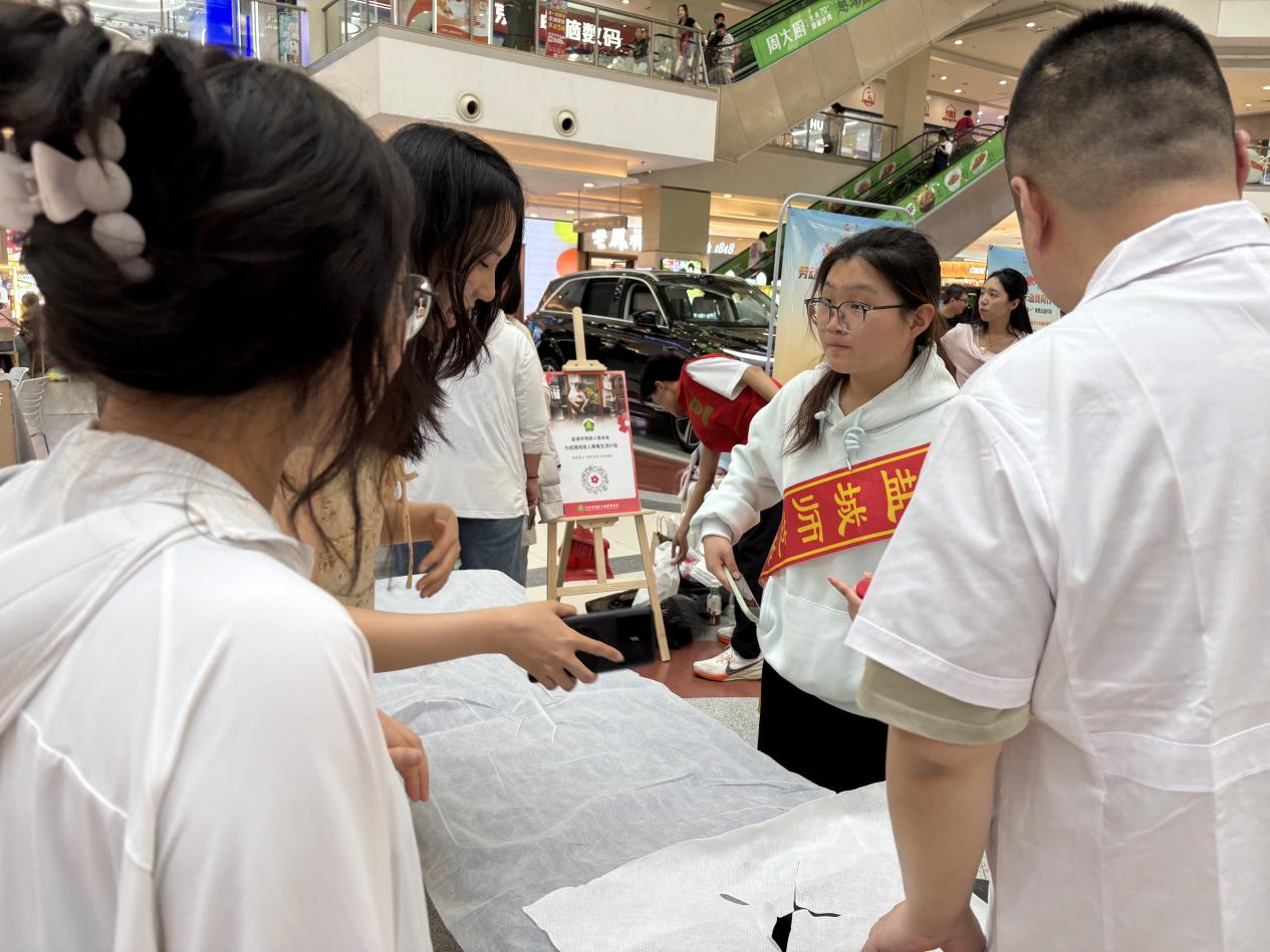 5月1日,在宝龙城市广场一楼中庭,志愿服务团参与了“劳动有光·助残同行”盐城市“五一”助残公益行动。团队成员耐心协助盲人推拿师,适时递上所需的工具,为前来咨询的现场观众提供义诊服务。同时成员们还向观众普及残健共融理念,倡导大家尊重和关爱残疾人群体,为困难残疾人筹集生活补贴。