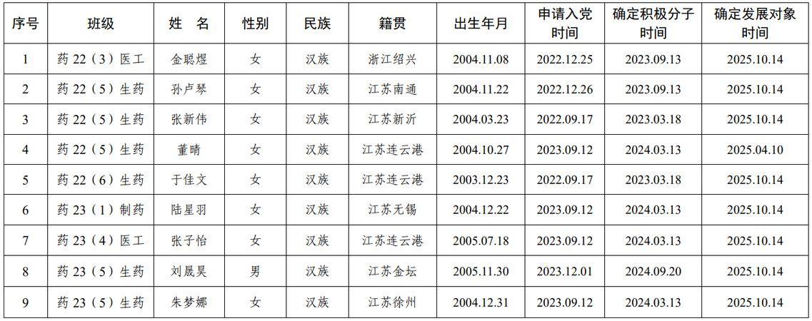 按照《中国共产党发展党员工作细则》相关规定,现对拟接收为中共预备党员的金聪煜等九名同志进行公示。为增强发展党员工作的透明度,减少工作中的失误和偏差,确保新党员的质量,特公示,公示期为2025年11月28日至2025年12月3日。如认为公示对象不符合党员标准、发展程序不符合规定,可通过来访、来信、来电等方式向本党支部、党总支反映,联系人:管老师,0515—88258905。