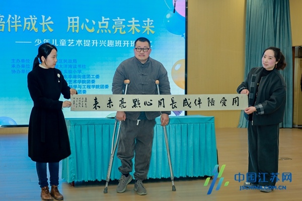 在才艺展示环节,三位项目辅导教师各展所长,将现场气氛推向高潮。书法辅导教师、盐城市“十佳自强之星”丁爱东现场挥毫泼墨,写下“用爱陪伴成长,用心点亮未来”的活动主题,笔力遒劲,情真意切;竹笛辅导教师、“泛音艺述”国风音乐空间主理人侍展宇倾情演奏《浮光》,笛声悠扬,意境深远;朗诵辅导教师、江苏省优秀讲解员唐静带来深情朗诵《就是那一只蟋蟀》,以声传情,感人至深。三位老师的精彩展示,赢得现场阵阵掌声,也让在场儿童提前感受到艺术课堂的魅力。