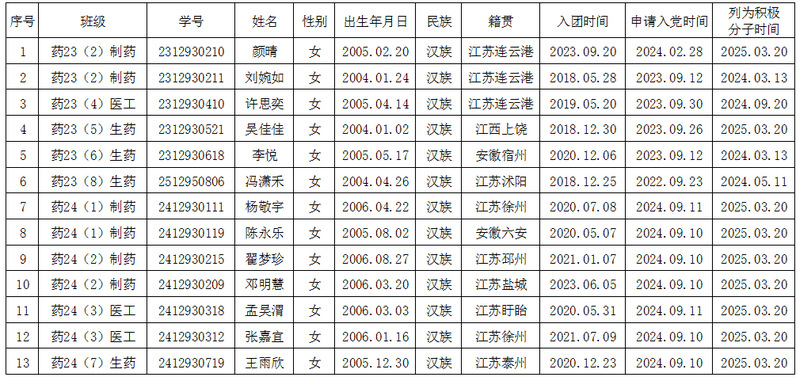 为充分发扬民主,把好党员发展质量关,经支部委员会研究,报上级党委备案同意,将颜晴等13名同志列为发展对象,现将有关情况予以公示。
